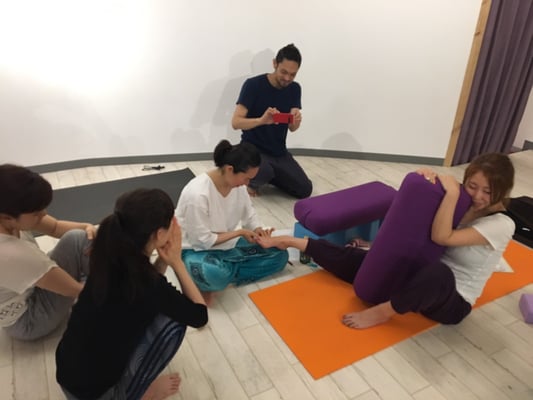 アーサナのトレーニングでは太ももの筋膜はがしを外くるぶしを使って行いました。皆さんあまりの痛さに悲鳴をあげつつ、そのあとのヴィラバドラーサナⅡとトリコナーサナの変化にビックリ!自身の身体とアーサナを通して、筋肉と体の動きの関係をわかりやすく学べたようです。